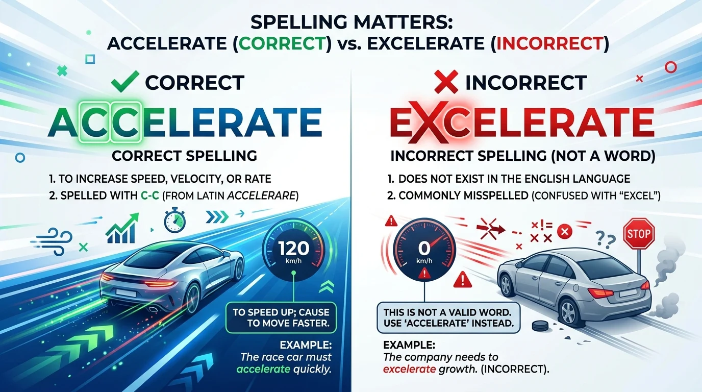 The difference between excelerate or accelerate is simple. “Accelerate” is correct, while “excelerate” is a common misspelling. The correct word always begins with “ac-” and means to increase speed or progress.